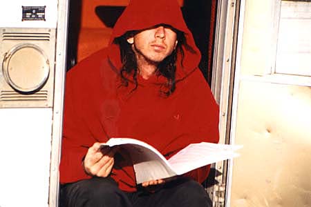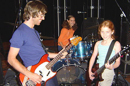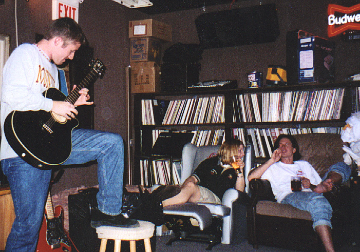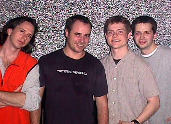 Fooling around in the studio, with guitarist Steve MacMillan, DJ "Mistress Bridget," and DJ Bolivia.
