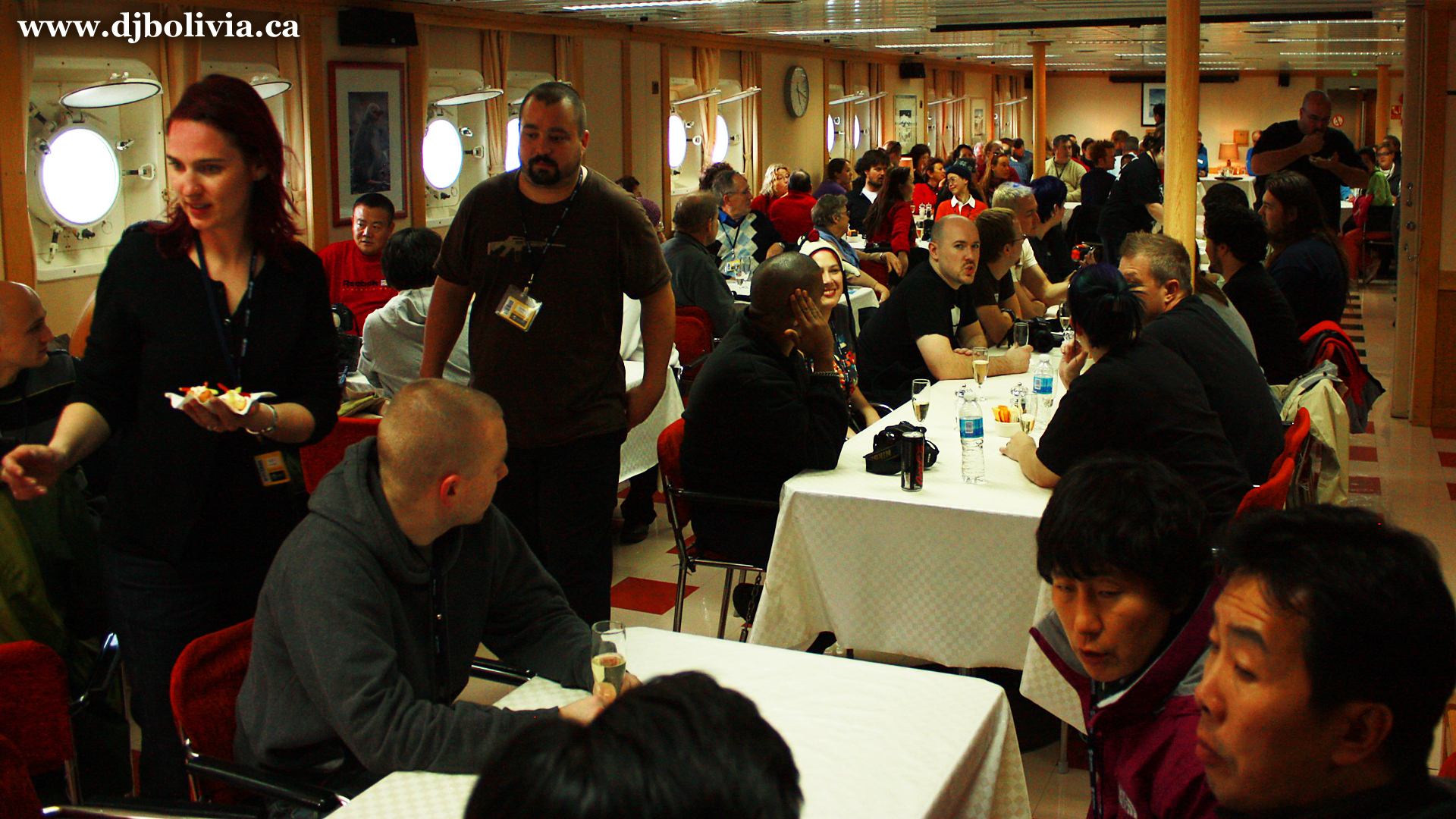 This is one of the nights that I was DJ'ing. I ended up doing three sets on the trip, which will all be online shortly. One was a drum & bass set for a semi-private party that we had down in the lecture hall. The second was a short progressive house set that I did while we were camping in Antarctica (very small audience and no amplification, but I had to be able to say that I was the first DJ to do a live set ON Antarctica). And this was the final set, a full three-hour tech-house set on Titanic Night in the ship's lounge. All three sets were done with a laptop and Ableton, since I obviously couldn't lug around any proper gear.