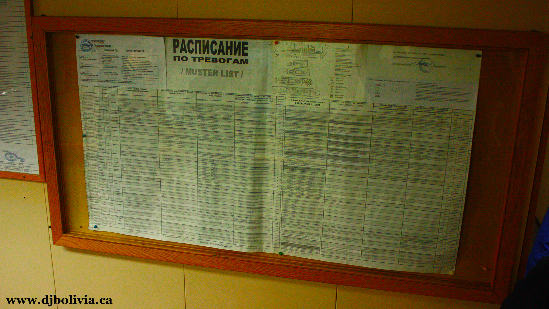 Ship's muster. Yes, that's cyrillic (Russian) on the board. The ship was built in Finland, but it was a Russian ice-strengthened research vessel. The crew was almost entirely Russian, although the ones that we talked to all spoke a bit of English. "Ice-strengthened" means one step below "ice-breaker," so we didn't really want to get iced-in anywhere.