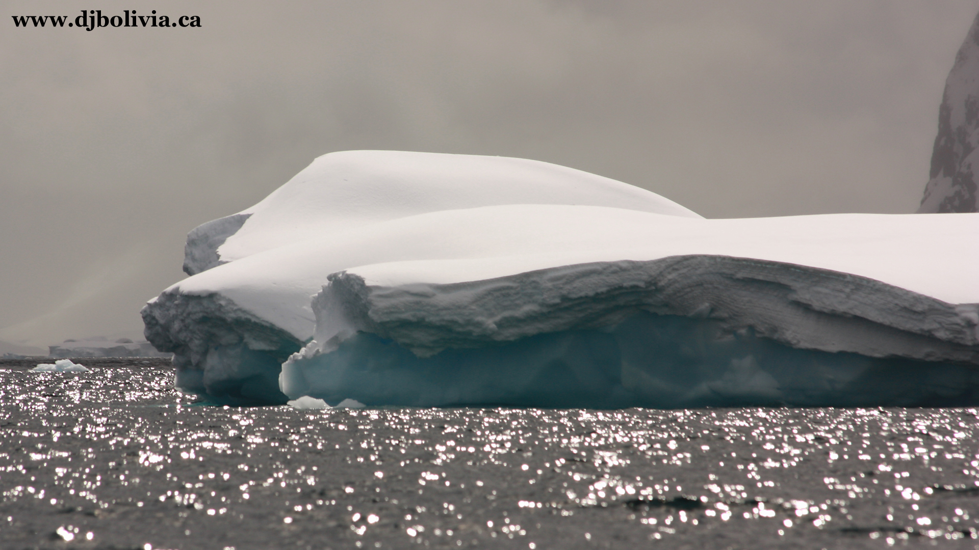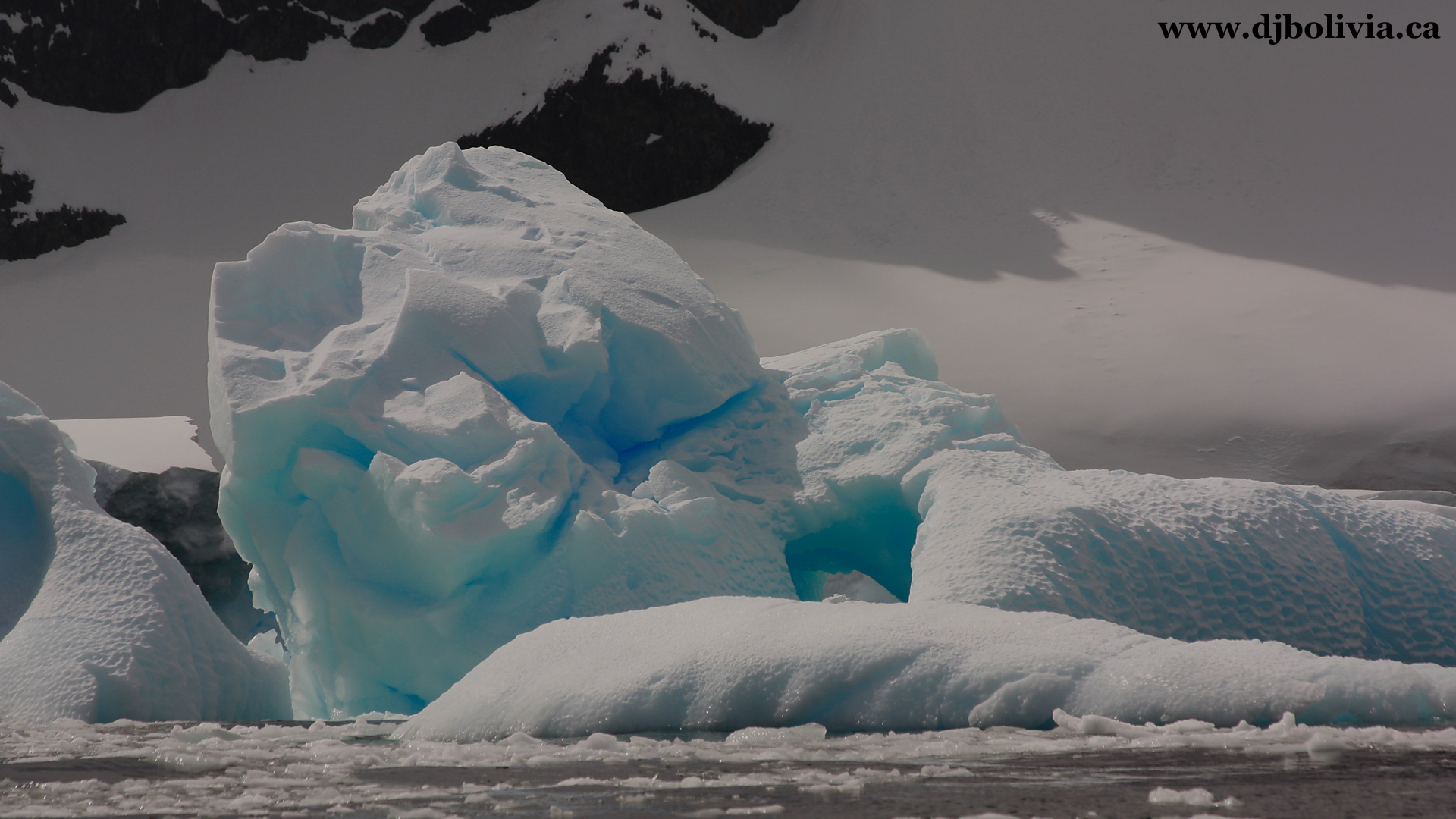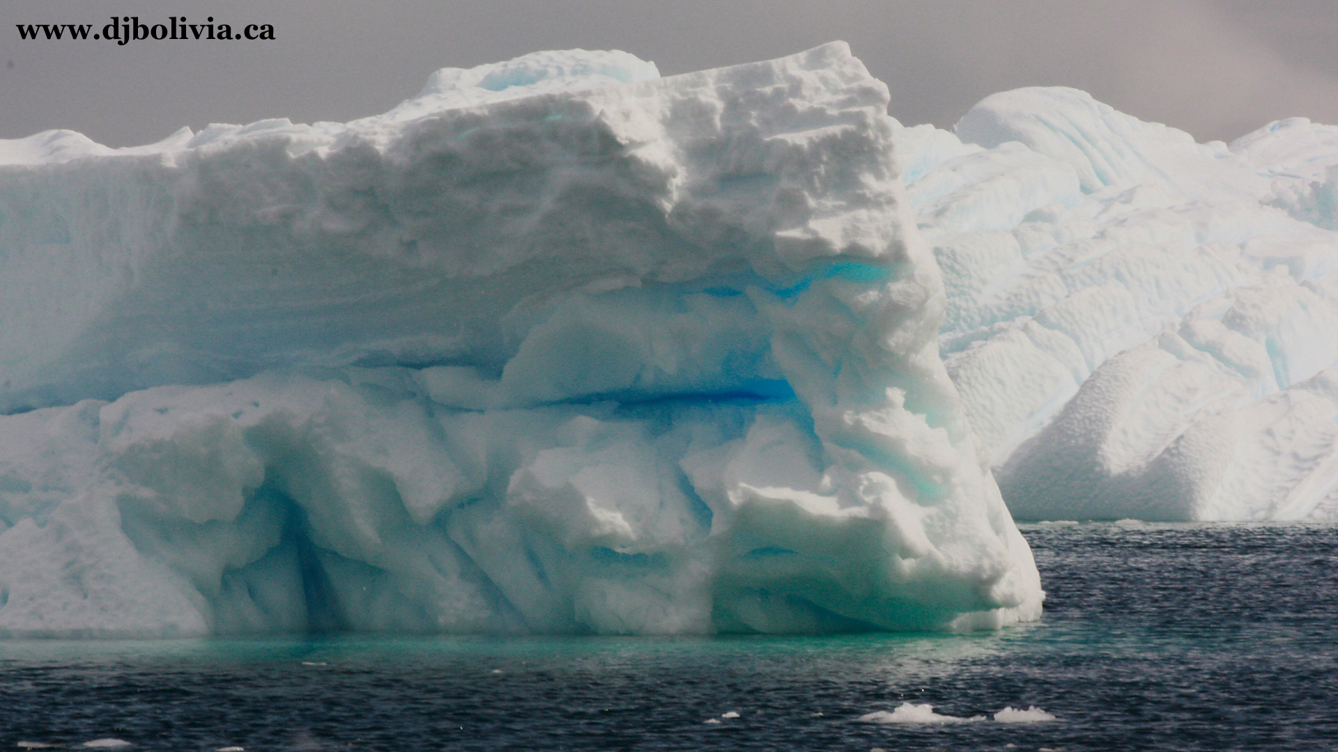 Some floating ice, and some shore ice (or glaciers). I used photoshop to touch up most of these photos slightly (especially with cropping, dimensions, and exposure). However, you'll be surprised to know that some of the photos that you will see here have absolutely no color/exposure/contrast work done to them. A lot of the ice really was this blue! Ice of this blue color means that it has been extremely compressed over a long period of time. By the way, remember that Antarctica (at the "bottom" of the world) is a continent, and has land underneath. Antarctica has penguins. It is a non-political area which does not "belong" to any country, and the entire continent has been delineated as being reserved for scientific research. There are some "bases" in various areas, set up by a dozen or so countries, but they aren't officially part of those countries. The Arctic, in contrast (at the "top" of the world) does NOT have land directly on the surface, under the ice, and instead of penguins it has polar bears.