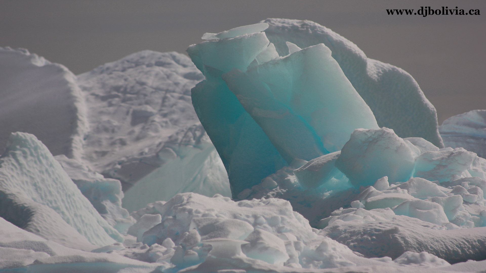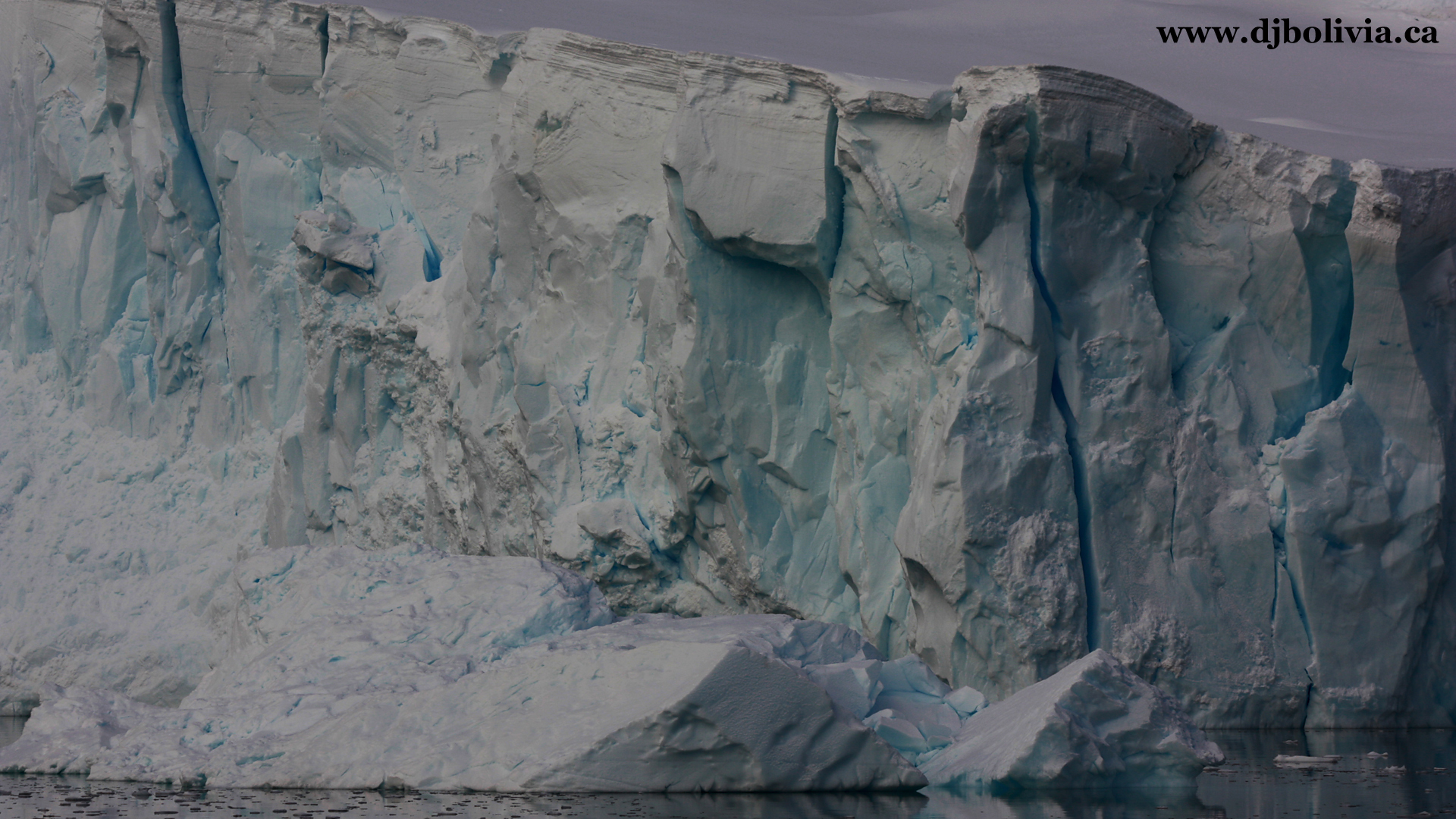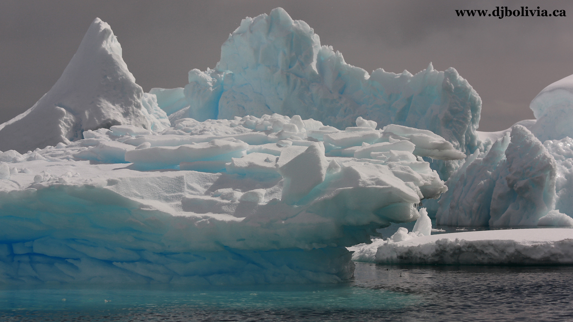 Some floating ice, and some shore ice (or glaciers). I used photoshop to touch up most of these photos slightly (especially with cropping, dimensions, and exposure). However, you'll be surprised to know that some of the photos that you will see here have absolutely no color/exposure/contrast work done to them. A lot of the ice really was this blue! Ice of this blue color means that it has been extremely compressed over a long period of time. By the way, remember that Antarctica (at the "bottom" of the world) is a continent, and has land underneath. Antarctica has penguins. It is a non-political area which does not "belong" to any country, and the entire continent has been delineated as being reserved for scientific research. There are some "bases" in various areas, set up by a dozen or so countries, but they aren't officially part of those countries. The Arctic, in contrast (at the "top" of the world) does NOT have land directly on the surface, under the ice, and instead of penguins it has polar bears.
